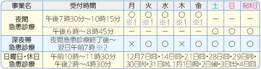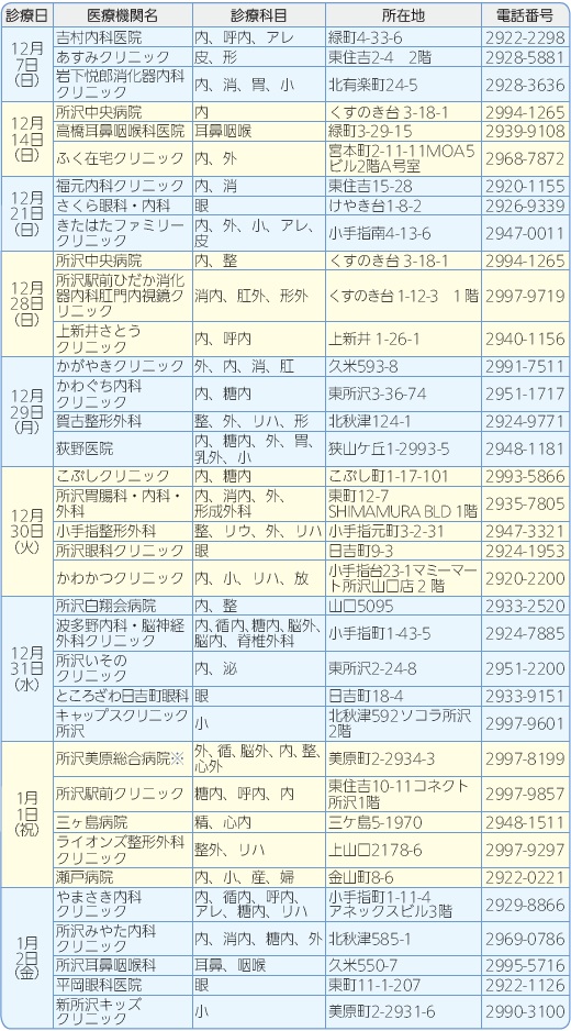 診療日/受付時間:12月7日(日)・14日(日)・21日(日)・28日(日)・30日(火)・31日(水)、1月2日(金)・3日(土)・4日(日)/午前9時~11時30分