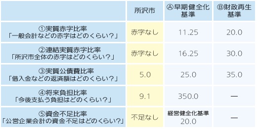 令和6年度決算に基づく所沢市の各種指標((1)~(5))は、国が定める基準を超えておらず、財政状況は健全です。