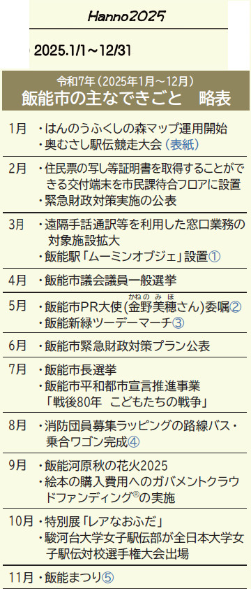 くらし 令和7年(2025年1月〜12月)飯能市の主なできごと 2/38 前の記事 次の記事 発行日 : 2026年01月01日 自治体名 : 埼玉県飯能市 広報紙名 : 広報はんのう 2026年1月1日号 令和8年(2026年)を迎えるにあたり、飯能市の令和7年の主なできごとを略表と写真で振り返ります。 ※写真は本紙またはPDF版をご覧ください。 Tweet シェアする 年頭あいさつ 第24回奥むさし駅伝競走大会を1月25日(日)に開催します