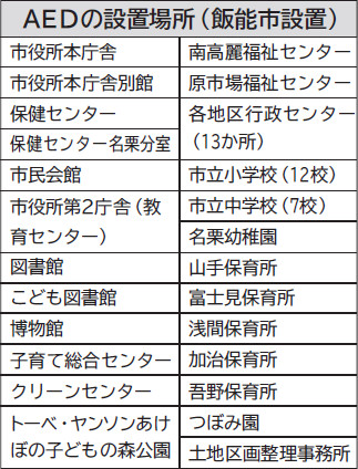 市内の主な設置場所は左の表のとおりです。そのほかの設置場所については飯能市ホームページ(ID3720)または埼玉県ホームページをご覧ください。