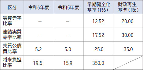「地方公共団体の財政の健全化に関する法律(財政健全化法)」による令和6年度の飯能市の財政指標を公表します。飯能市においては、いずれの指標も基準内の数値となっていますが、資金面においては、極めて危機的な事態に直面しております。こうした事態からいち早く脱却し、将来にわたり持続可能な行財政運営を確立させるため、「飯能市緊急財政対策プラン」に取り組んでいます。詳細は飯能市ホームページ(ID:4025)をご覧ください。