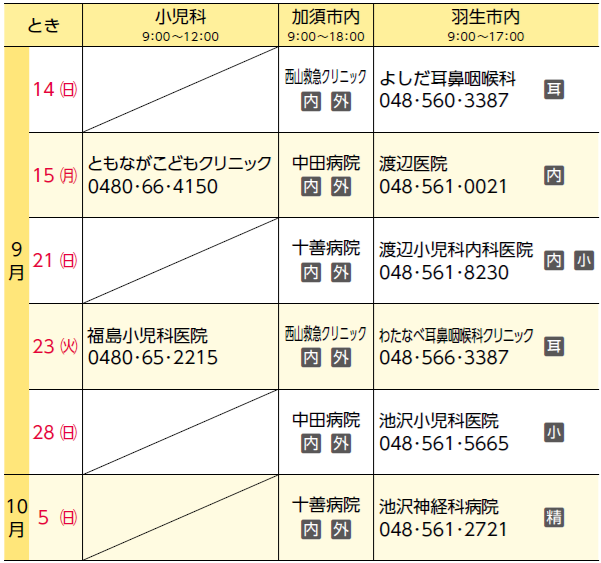 ※小児救急電話相談【電話】#8000または【電話】048-833-7911(北川辺地域)もご利用いただけます。