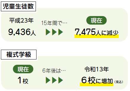 児童生徒数は、減少傾向にあり、今後、複式学級(2つの学年の児童生徒で編制する学級)が存在する規模の学校が増加する見込みです。