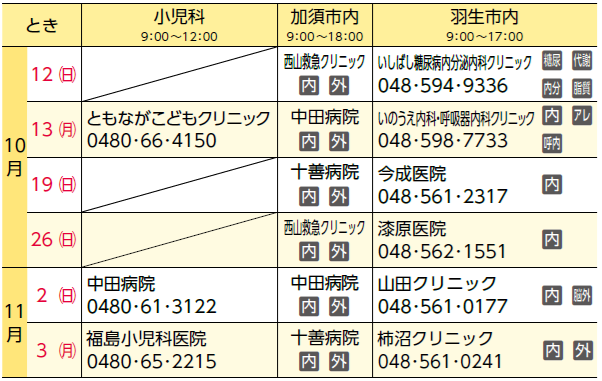 ※小児救急電話相談【電話】#8000または【電話】048・833・7911(北川辺地域)もご利用いただけます。