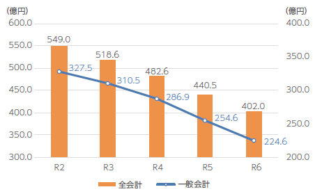一般会計において、元和小学校校舎増築のための借り入れなどを行いましたが、新たな市債の借入額よりも過去に借り入れた市債の償還額の方が大きかったため、市債残高は減少しました。また、全会計の合計についても、市債残高は減少しました。