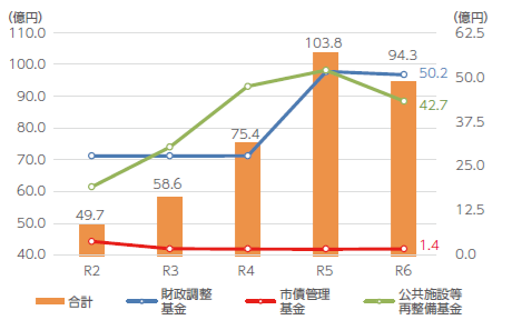 積み立てた基金を事業に活用したことで、主要3基金の残高は減少しました。なお、財政調整基金は予算の全体調整により不足する財源として、公共施設等再整備基金は元和小学校校舎増築工事などに要する経費の財源として取り崩しを行いました。
