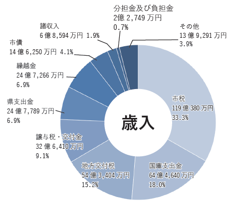定額減税の実施により市税のうち個人市民税が減少となったものの、地方交付税や中学校の大規模改修のために借入れた市債の増加等により、総額は前年度と比較し10億1,849万円(2.9%)増の357億6,773万円となりました。