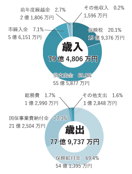 一方で、歳出決算額は、77億9,737万円(前年度比1.74%減)となりました。歳出の主な項目は、医療費の支払いに充てる保険給付費が69.4%、国保事業費納付金が27.3%となっています。