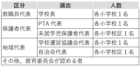 統合準備委員会は教職員、保護者、地域の代表者と教育委員会が認める者で構成され、次の事項について協議を行います。