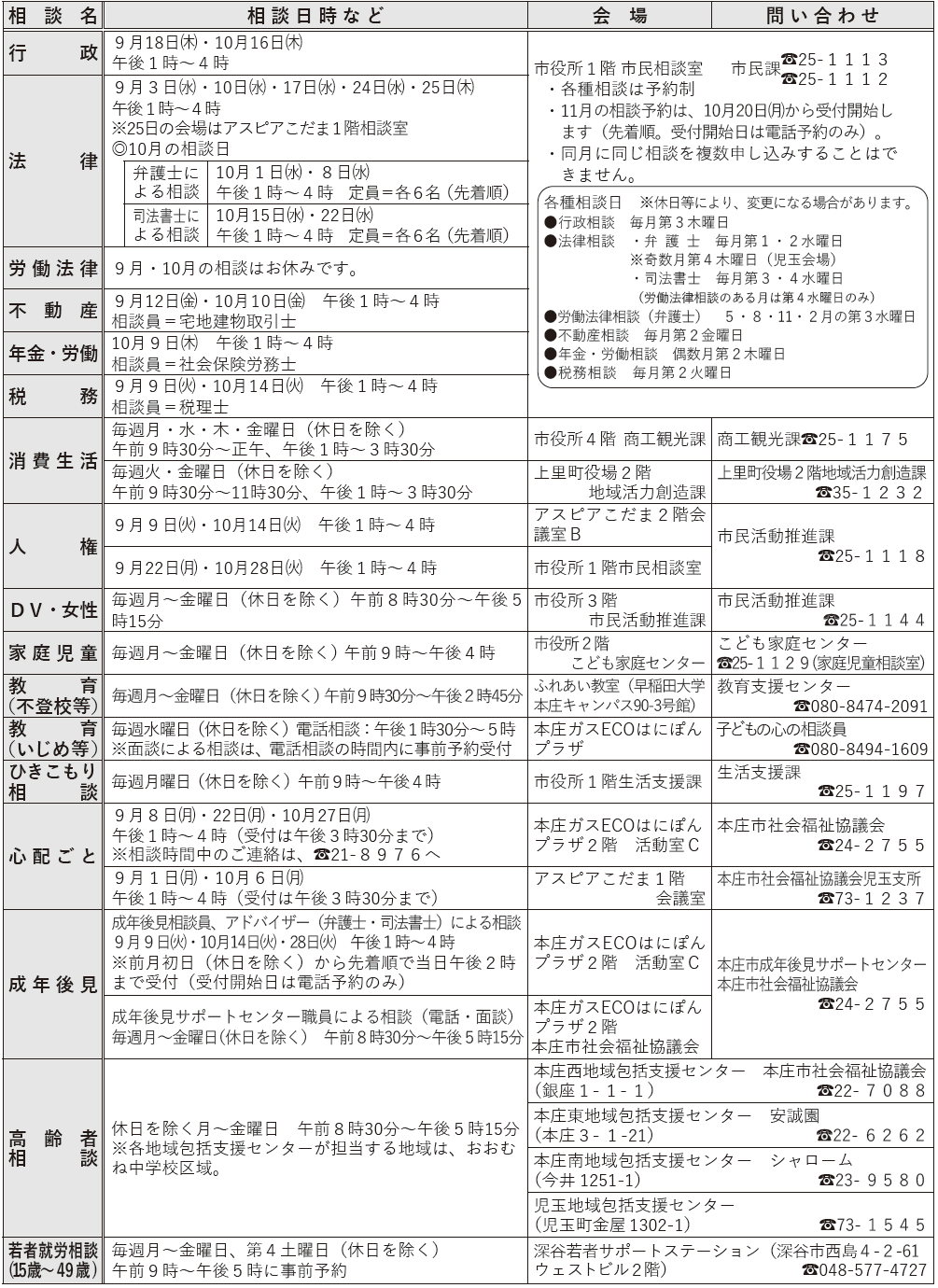 くらし 市民相談(9月〜10月) 27/34 前の記事 次の記事 記事を読み上げる 発行日 : 2025年09月01日 自治体名 : 埼玉県本庄市 広報紙名 : 広報ほんじょう 2025年9月1日号 相談は無料、秘密は厳守します。お気軽にご相談ください。 市役所受付時間:午前8時30分~午後5時15分 ※感染症の拡大を防止するため、中止となる場合がありますのでご了承ください。 Tweet シェアする 図書館だより 環境 環境への負荷を減らし持続的に発展していくために