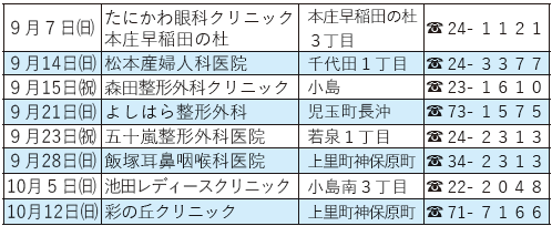 問合せ:本庄市児玉郡医師会立本庄市休日急患診療所