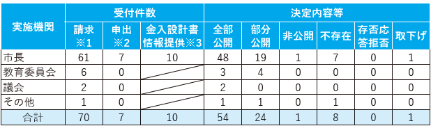 ・1件の公開請求に対し、複数の決定がなされたものがあったため、決定内容等の合計が受付件数の合計よりも多くなっています。