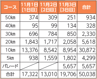 第48回日本スリーデーマーチは秋晴れに恵まれ、国内外から3日間で延べ50,038人の参加をいただき、熱気と賑わいに包まれ、盛会のうちに終えることができました。これもひとえに、市民の皆様をはじめ、11の支援市町村の皆様、関係機関、協賛企業・各種団体の皆様、そしてこの大会の運営に携わった全ての皆様のご支援とご協力の賜物と心から感謝申し上げます。