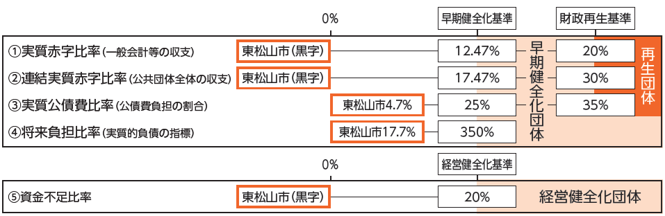 令和6年度の決算が確定しましたので、健全化判断比率及び資金不足比率を公表します。いずれの指標(比率)も、財政状況の”黄色信号”とされる早期(経営)健全化基準を下回りました。