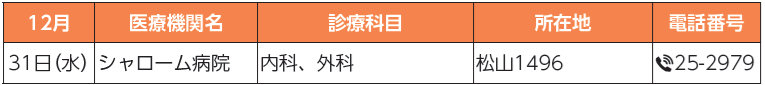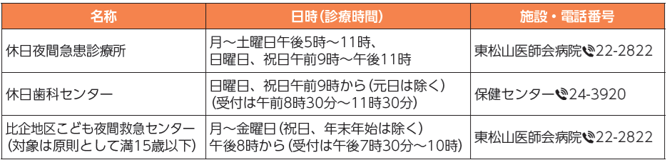 ※休日当番医のほかにも、比企地域には日曜日に診察をしている医療機関があります。日曜日に診察している医療機関は、市ホームページで確認してください。