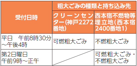 家庭粗大ごみを処分する際には、クリーンセンター(可燃物)又は西本宿不燃物等埋立地(可燃物以外)に直接持ち込む方法と有料戸別収集があります。