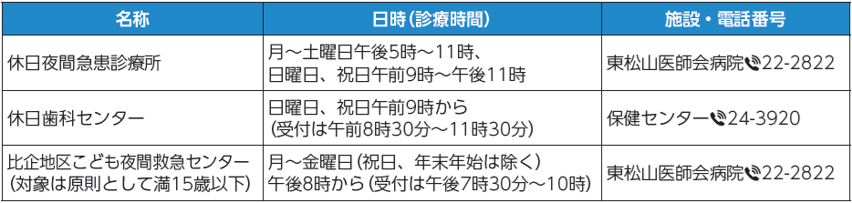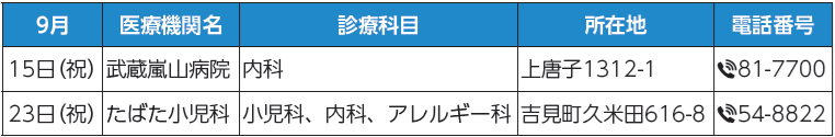 ※休日当番医のほかにも、比企地域には日曜日に診察をしている医療機関があります。日曜日に診察している医療機関は、市ホームページで確認してください。
