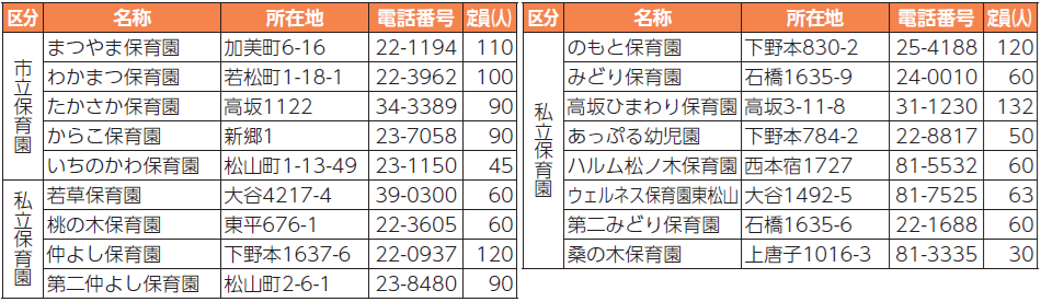 ・市立保育園のうち、まつやま保育園以外の園は、指定管理者(アートチャイルドケア株式会社)による運営です。