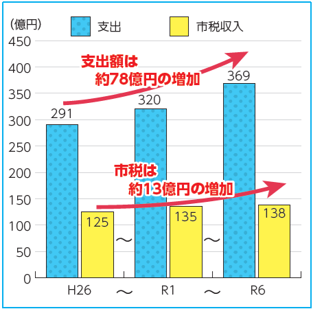 一方、市民税や固定資産税など、市の税収は少しずつ増えていますが、支出の伸びに追いついていません。