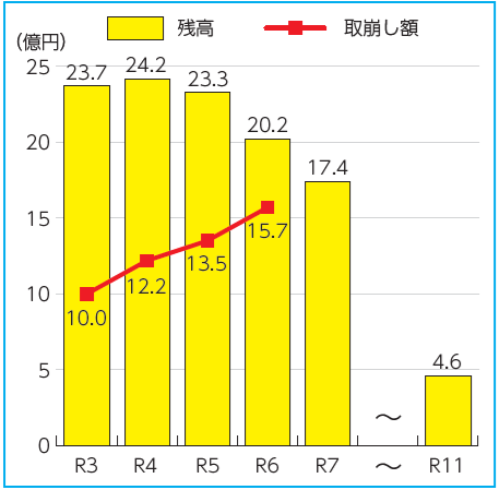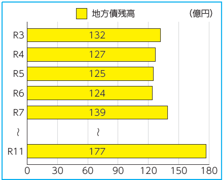令和6年度までは同額程度で推移していましたが、市民生活の基盤づくりや暮らしを守るために必要な大規模事業の実施に伴い、借金の残高は確実に増えていきます。