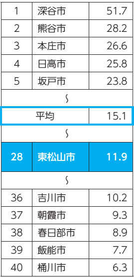 右の表は、令和5年度実績における県内40市の財政調整基金比率(※)の順位を示したものになります。本市は真ん中より低い順位に位置しており、その上、令和6年度実績については9.9%とさらに低い数値となっています。
