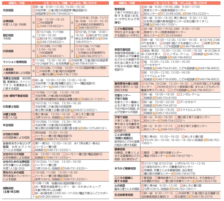 くらし そうだん 25/32 前の記事 次の記事 発行日 : 2025年10月01日 自治体名 : 埼玉県春日部市 広報紙名 : 広報かすかべ 2025年10月号 市などで行われている無料相談です。相談日は閉庁・休館日などをのぞきます。 市:市役所第二庁舎2階市民相談室で行う相談 庄:庄和総合支所2階相談室(行政相談は1階イベント・情報コーナー)で行う相談 Tweet シェアする INFORMATION かすかべ情報~スポ・レク みんなの伝言板 ~市民からの催し物案内、サークルの会員募集~(1)
