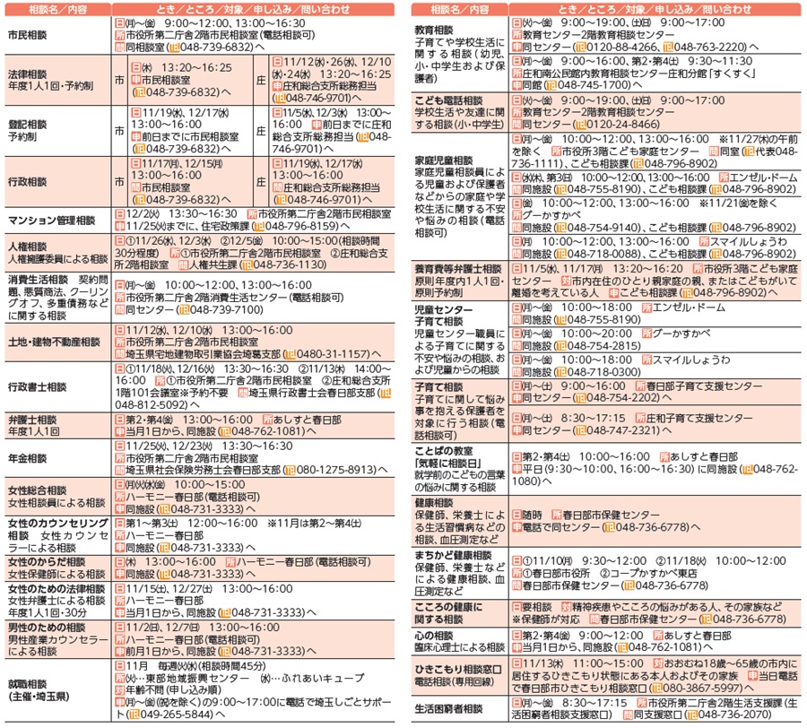 くらし そうだん 29/37 前の記事 次の記事 発行日 : 2025年11月01日 自治体名 : 埼玉県春日部市 広報紙名 : 広報かすかべ 2025年11月号 市などで行われている無料相談です。相談日は閉庁・休館日などをのぞきます。 市:市役所第二庁舎2階市民相談室で行う相談 庄:庄和総合支所2階相談室(行政相談は1階イベント・情報コーナー)で行う相談 Tweet シェアする INFORMATION かすかべ情報~スポ・レク みんなの伝言板 ~市民からの催し物案内、サークルの会員募集~