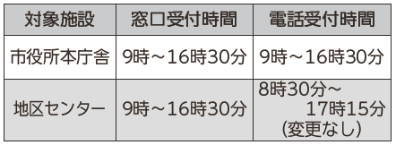 8年2月2日(月)から、市役所本庁舎などの窓口受付時間が変わります。職員の働き方改革の推進と業務効率・サービス品質の向上を図っていきます。ご不便をおかけしますが、ご理解とご協力をお願いします。