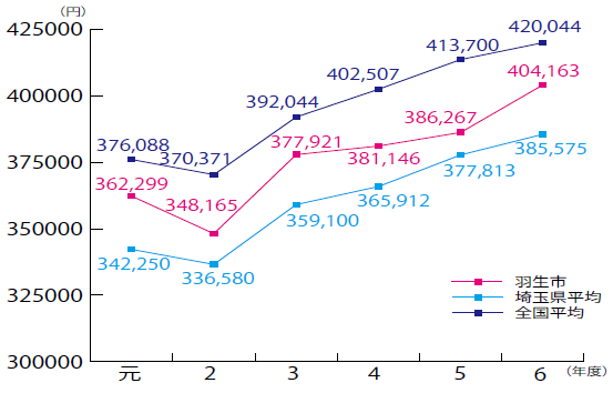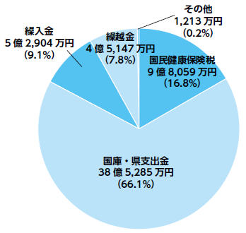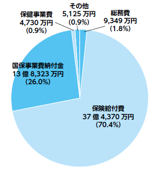 令和6年度の歳入は58億2,608万円、歳出は53億1,897万円となり、被保険者の皆さんの医療費の支払いに充てる「保険給付費」は37億4,370万円で、歳出総額の70.4%(前年度比0.2%増)を占めています。一人当たりの医療費は、40万4,163円で、県平均の38万5,575円を上回り、前年度と比較して4.6%増加しました。
