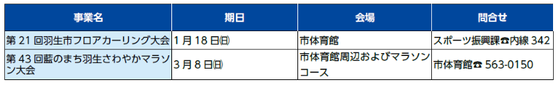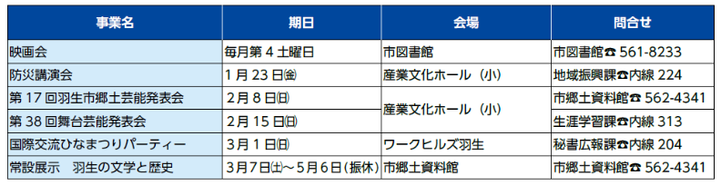 くらし 生涯学習カレンダー 33/51 前の記事 次の記事 記事を読み上げる 発行日 : 2025年12月01日 自治体名 : 埼玉県羽生市 広報紙名 : 広報はにゅう 令和7年12月号 1月~3月に予定しているイベントなどを紹介します。変更または中止になる場合もありますので、詳しくは各問合せ先にご確認ください。 ■イベント ■親子・子ども向け ■スポーツ ■公民館まつり Tweet シェアする 「プレコンセプションケア相談センター埼玉ぷれたま」に相談してください 羽生市立小中学校適正規模・適正配置に関する基本方針を決定しました