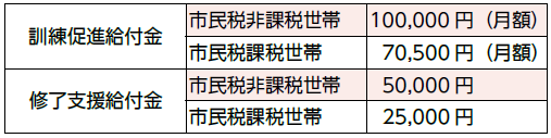 就業のため資格を取得しようとする方に、訓練促進給付金を支給します。養成課程の修了後は、修了支援給付金を支給します。