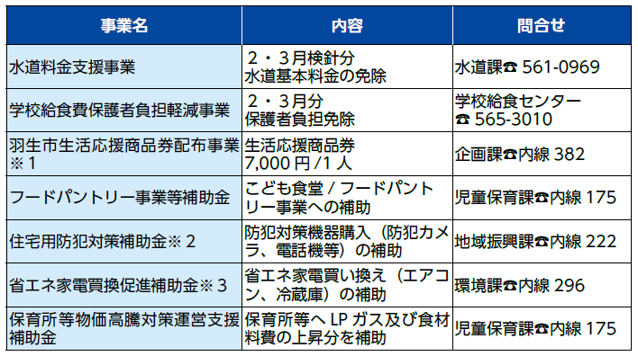 くらし 物価高騰対策事業の内容が決定しました 30/51 前の記事 次の記事 記事を読み上げる 発行日 : 2026年02月01日 自治体名 : 埼玉県羽生市 広報紙名 : 広報はにゅう 令和8年2月号 ■12月定例市議会、1月開催の臨時市議会で予算化した事業 上記事業は、国の重点支援地方交付金を活用しています。 ※1~※3の詳細は広報はにゅう3月号、4月号で改めてお知らせします。 Tweet シェアする 北彩タウン情報~でかけませんか となりまち~ 安心・安全な水を供給しています