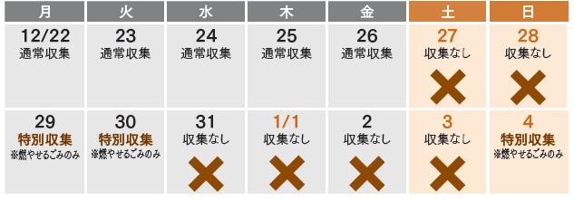 12月29日(月)・30日(火)、令和8年1月4日(日)に、『燃やせるごみ』のみを特別に収集します。午前8時30分までにごみ収集所へ出してください。