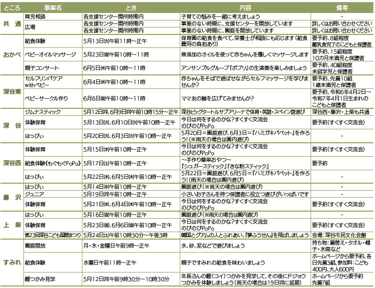 ※事業により年齢制限がありますので、備考欄をご確認ください。記載がない場合は、未就学児と保護者が対象です。