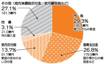 市民の皆さんが納めたお金(市税)、国・県からもらうお金(国県支出金)が主な財源になっています。