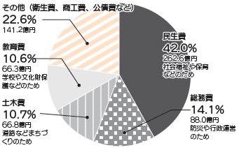 使ったお金(歳出)は、こどもや高齢者など、社会福祉のための民生費に多く使っていることが分かります。