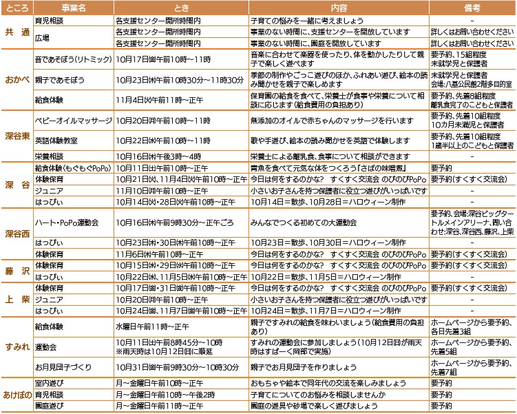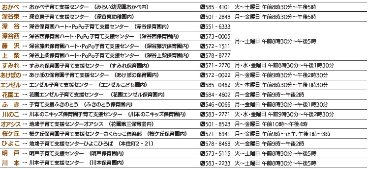 ◇予約制のものは、各支援センターに直接お問い合わせください。なお、お休みや事業を行っている時は、電話に出られない場合があります。