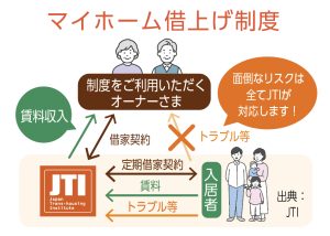所有する住宅を移住・住みかえ支援機構(JTI)が借上げ、子育て世帯等に転貸する制度。空室が発生した場合でも一定の賃料収入が保証される。自宅を売却せずに、住みかえや老後の資金として活用できる。