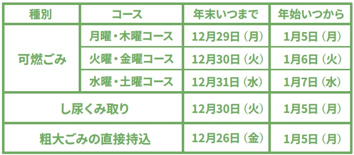 年末年始のごみ収集スケジュールは下の表のとおりです。不燃ごみや資源物の収集はごみ収集カレンダーまたはごみ分別アプリで確認してください。また、年末年始は粗大ごみ回収の予約が集中するため、環境業務センターへの持込みもご検討ください。
