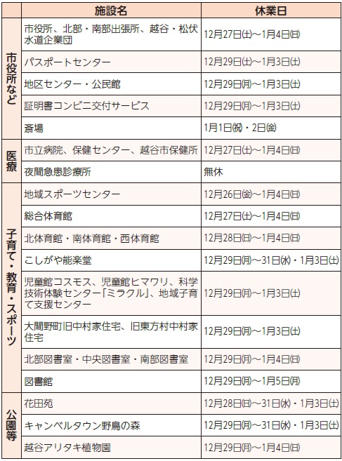 くらし 年末年始の施設のお休み 23/65 前の記事 次の記事 発行日 : 2025年12月01日 自治体名 : 埼玉県越谷市 広報紙名 : 広報こしがや 令和7年12月号 年末年始の市役所などの業務日程をお知らせします Tweet シェアする 年末年始のごみ収集 休日当番医・薬局