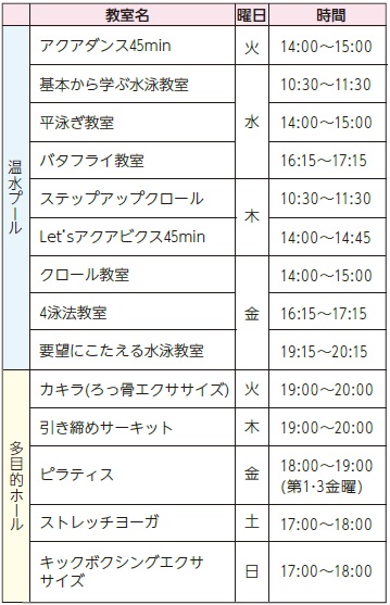 ・温水プール…1回600円(アクアダンス、Let’sアクアビクスは1回500円)。別途施設使用料が必要