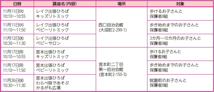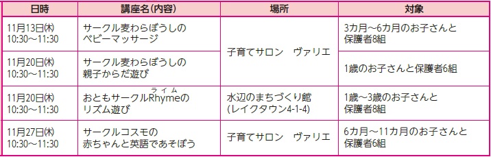 申込み:10月10日(金)まで。メールの件名に「講座名」を、本文に講座名・参加日・住所・親子の氏名(ふりがな)・お子さんの月齢(講座当日)・電話番号を記入し、申し込み専用アドレス(【E-mail】[email protected])へ。
