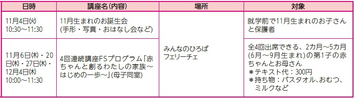 申込み:10月15日(水)まで。みんなのひろばフェリーチェホームページの申し込みフォームから。参加可否を必ず返信します。締切日以降1週間たっても返信のない方は、電話でご確認ください
