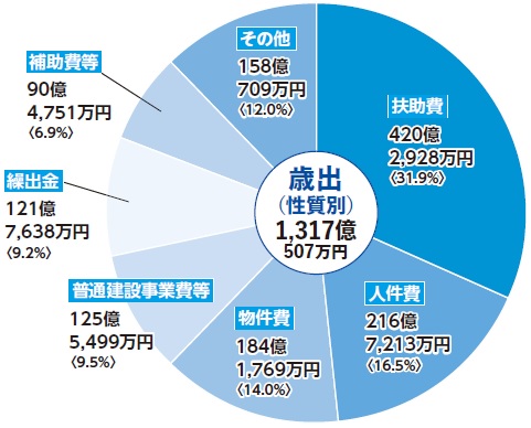 令和6年度の歳入(収入)は、地方交付税の増加などにより、令和5年度と比べて40億5,042万円増えましたが、歳出(支出)も38億6,093万円増えました。歳出のうち、最も多くの割合を占める扶助費は、福祉サービスなどに関する経費です。