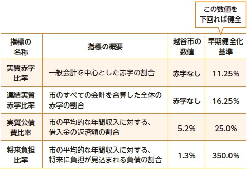 財政破綻を早期の段階で回避するための目標である「財政健全化判断比率」は、すべての指標で早期健全化基準を下回っているため、市の財政は健全な状態といえますが、将来を見据えて、限られた財源をむだなく効果的に使っていく必要があります。