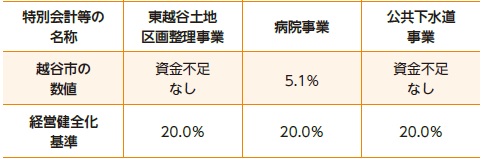 ※資金剰余の場合は「資金不足なし」としています。東越谷土地区画整理事業は、事業規模(営業収益)がないため資金不足比率が算出されません。公共下水道事業は▲39.5%です