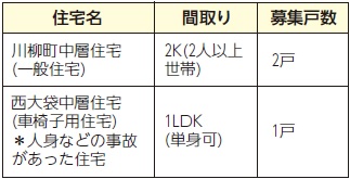 住宅名・間取り・募集戸数:下表のとおり