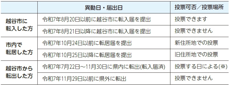 ※…転出の時点で越谷市の選挙人名簿に登録されている方で、投票日現在において、転出後4カ月を経過していない方(県内転出者に限る)は投票できます。併せて、投票所で次のいずれかの方法により、確認を受ける必要があります。