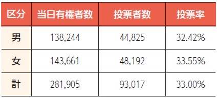 開票は同日、21:00から総合体育館で行われ、22:38に確定しました