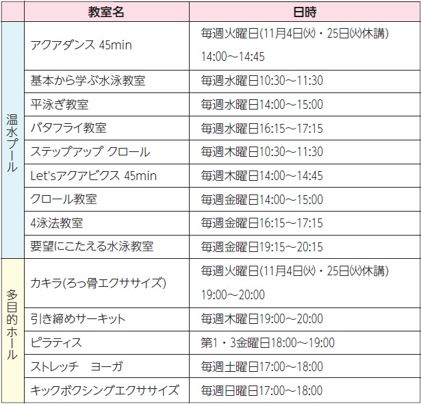 教室名・日時:下表のとおり。休講の場合あり